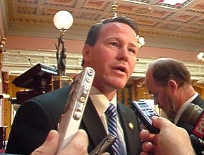 Republican John Husted, Speaker of the House, addresses reporters in Columbus.