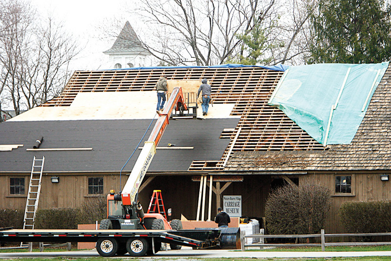 The Jim Santini Construction Co. of Washingtonville repairs the roof on the Historical Carriage Building at Canfield Fairgrounds.