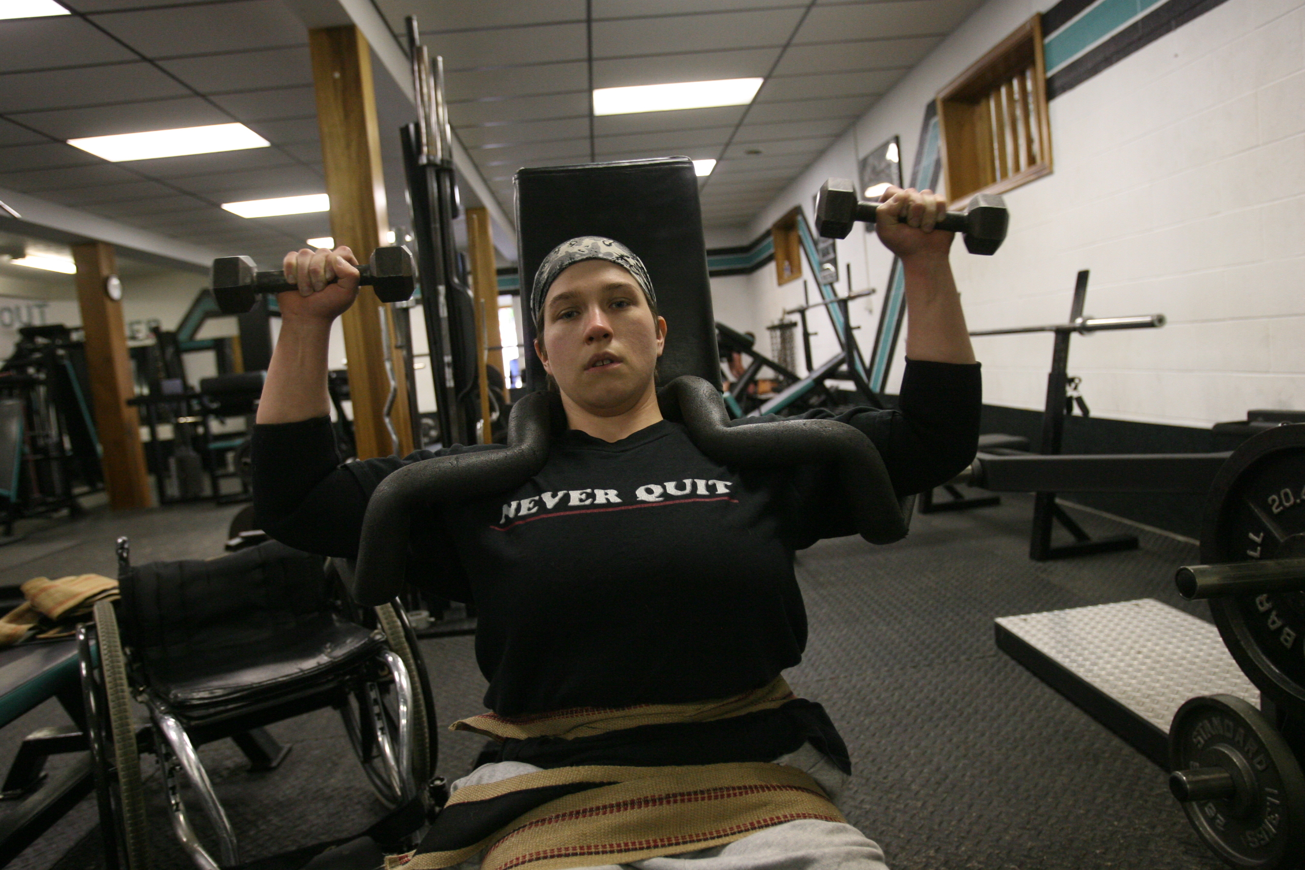 Assisted by her trainer, Brian Raneri, Chelsi Figley prepares to complete a bench press. The 27-year-old East Palestine resident, who has spina bifida, will compete in the Paralympic games in Malaysia later this year.