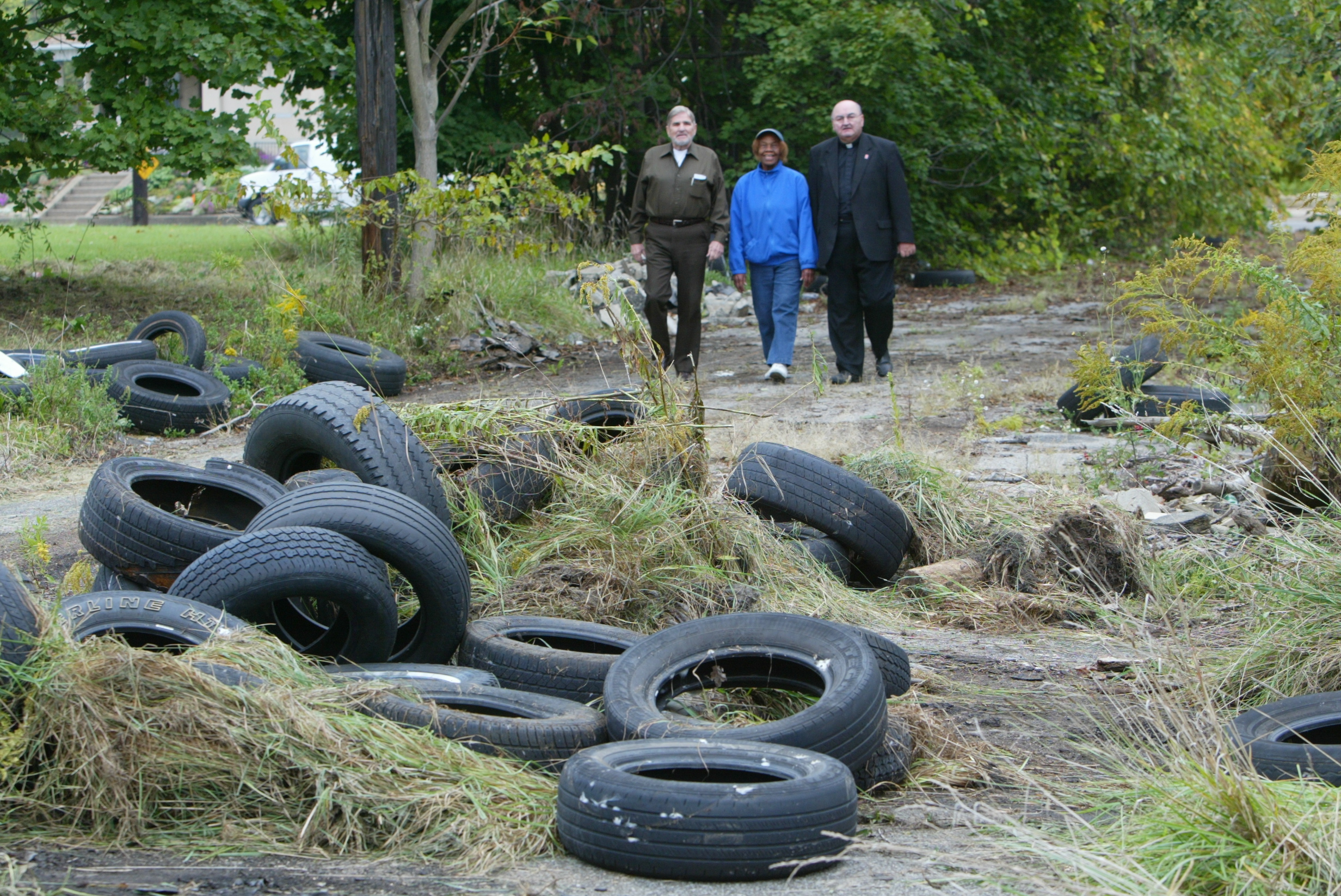 John Lesnansky, left, Helen Jackson and The Rev. Nicholas Mancini survey tires that will be cleaned up on Wilson Avenue across from St. Stephen of Hungary Church. The former Lewis Auto Body shop has been a popular illegal dumping ground since it closed in the 1970s.
