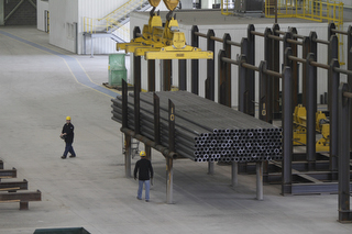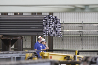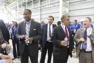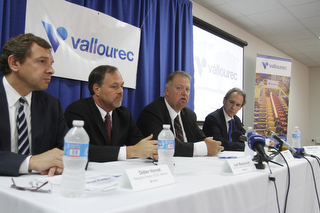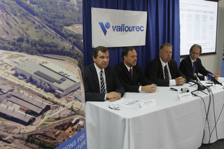 Former Youngstown Mayor Jay Williams and current Mayor Charles Sammarone are on hand for the dedication ceremony at the Vallourec Star seamless pipe mill in Youngstown.