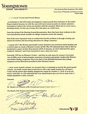 “In August 2017, the Women and Gender Center Initiative was promised ample funding and a central space to create a Women’s Center at YSU,” the letter says. “The YSU administration told us that we would have a space no later than January 2018. In January, we were informed this space would be ‘delayed,’ and it has remained in such a state ever since.”