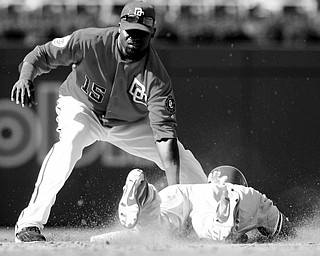TAGGED OUT: Cleveland Indians third baseman Andy Marte, left, tags …