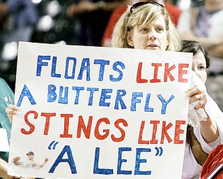 PROGRESSIVE SUPPORT: An Indians fan holds up a sign after her team defeated the White Sox on Monday at Progressive Field. Starter Cliff Lee tossed a five-hitter for the Tribe.