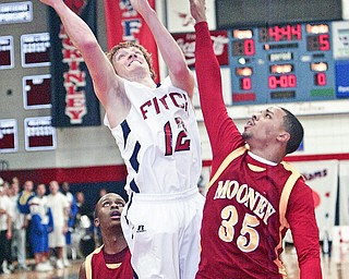 William Mahone of Fitch drives to the hoop past Donald D'Alesio of Mooney during Tuesday action at Fitch.