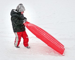 Hayden, 3 1/2, and mom, Amanda Taylor of Hubbard, didn't let a little snow and cold stop their fun as they played on the hills in Wick Recreation area in Mill Creek Park