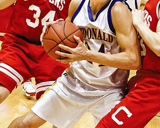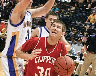 GOING UP: Warren Harding Tre' Browm takes a shot as BOardman's Eric Soller defends during the fourth quarter of Tuesday's game in Warren.