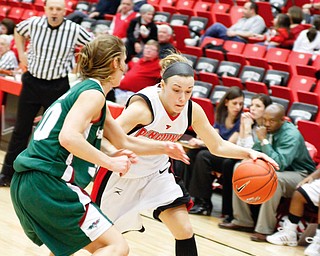 Jaquetta WEstley of YSU drives around Kristen Petrinec of UIC .