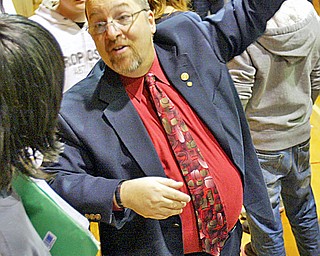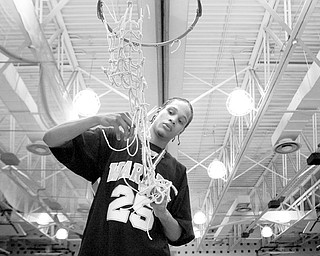 Isiaha Henderson (25) cuts off a piece of the net after Warren Harding defeated St. Ignatius 52-42 at Warrington Heights, Saturday afternoon.