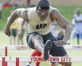 Mooney's MAtt McWilson, left, and Harding's DeAver Williamson go for the finish line in a 100 semi final Thursday at Chaney. Williamson won the semi final.