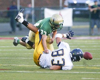 The Vindicator/Robert K. Yosay -- Ursulines #33 Jeff Pedolsky breaks away ffrom Vikings #21 Brian Palermo during first quarter action at Wheeling Island Stadium 952009