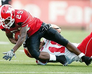 PROJECT MOVING AHEAD: Tony Hayek, left, an architect with MS Consultants Inc. of Youngstown, explains two possible roof styles for the proposed WATTS indoor athletic-training facility at Youngstown State University to YSU Trustee John Jakubek.