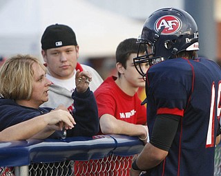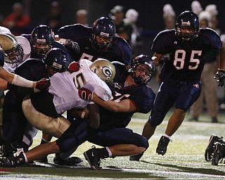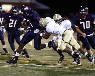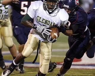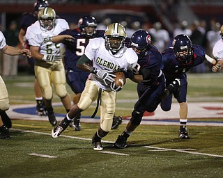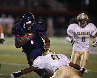 The Vindicator/Robert K. Yosay--- Fitch's Jon Ballard breaks thru the line and a tackle by Glenoak Brandon Martin during first quarter action at Fitch stadium - Ballard went on to score his 5th season rushing …
