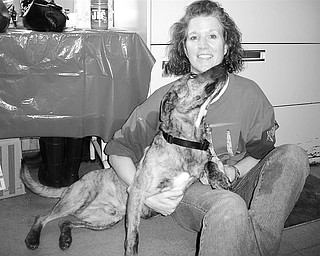 Joy Knapp, a volunteer at the Animal Welfare League of Trumbull County, gets a loving look from “Lester,” one of 162 dogs the league rescued from a Gustavus Township home earlier this year. Lester, the …
