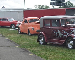 Joseph Paglia poses with his father's car Friday at the Steel Valley Super Nationals at the Quaker City Motorsports Park. The rain prevented racing Friday, the first day of the event.
