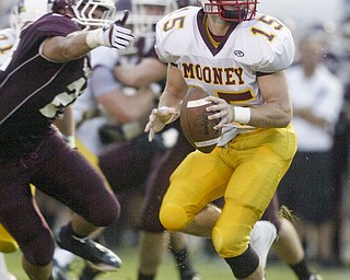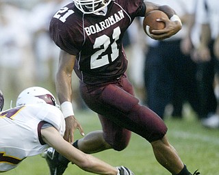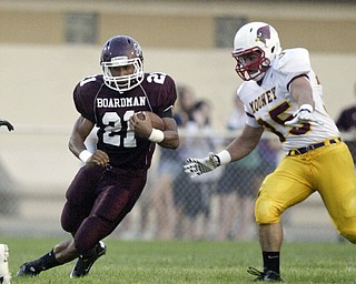 Cardinal Mooney’s Roosevelt Griffin (3) sprints away from Boardman defender Ryan Ebie (33) during Friday’s game in Boardman. The Cardinals got their second win of the season, edging the Spartans, 27-20.