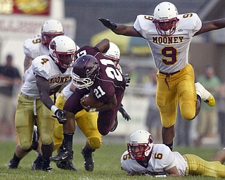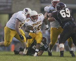 Campbell running back Ja’les Hughes (2) breaks away from South Range defenders for a gain in Friday’s game during Week 2 of the 2011 prep football season at South Range High School in Beaver Township. …