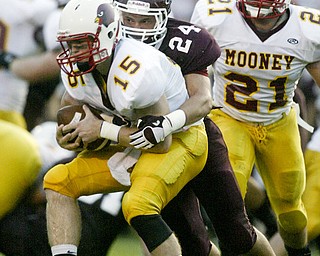 Poland’s Conner Schultheis (24) stops Fitch’s Will Mahone (13) in Friday’s game at Fitch’s Falcon Stadium in Austintown. The Falcons scored on the next play and went on to defeat the Bulldogs, 21-3.