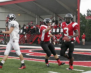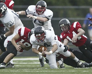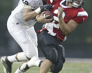 ROBERT K. YOSAY | THE VINDICATOR --..Howlands #7 Zach Wilson and #6 Ken Pozega Twists down #2 Warren Jalyn Powell in the backfield of the first quarter action..Howland Tigers vs Warren G Harding Raiders @ …