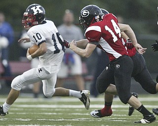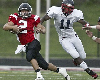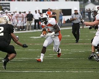 ROBERT K. YOSAY | THE VINDICATOR --..Howlands #6 puts on the moves on #9 Warrren Lebrandon Watson as he looks down field on his way for a first and 10 during second quarter action -...Howland …
