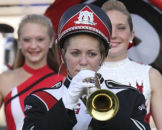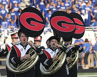 The Hubbard High football team kneels in front of the band as the alma mater is played following the Eagles’ 56-0 shutout win over Cleveland Collinwood