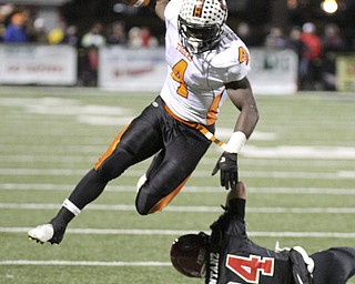 ROBERT K. YOSAY | THE VINDICATOR..JFK #16 Robert Seger tries to stop YCS #81 Nick Gonda as he leaps into the air to get the second touchdown for YCS of the night ..First round of …