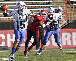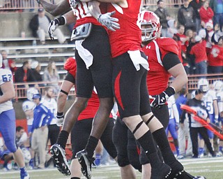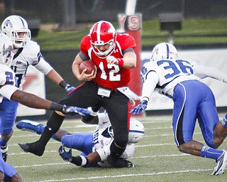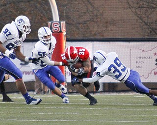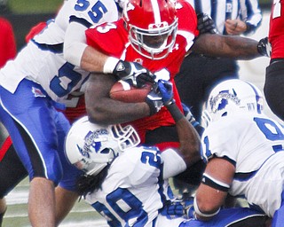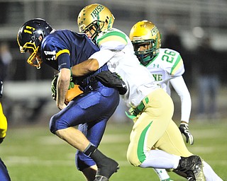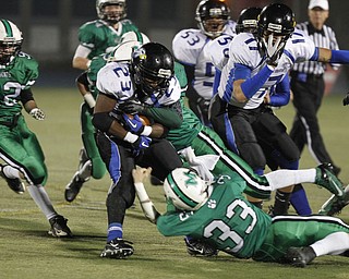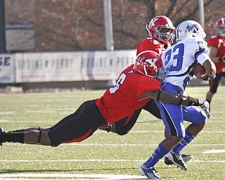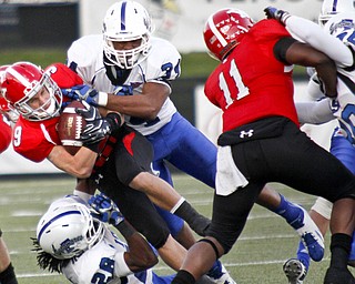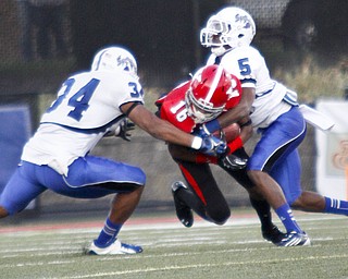 ROBERT K. YOSAY | THE VINDICATOR --..YCS Ryan Grier is stopped by Mogadores # 82 Kasey Beard and #92 (underneath Matt Nolfi during first quarter action -..YCS vs Mogadore at Ravenna...(AP Photo/The Vindicator, Robert K. …