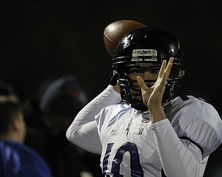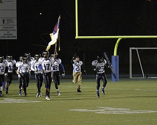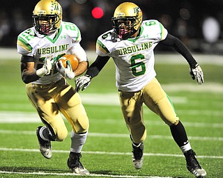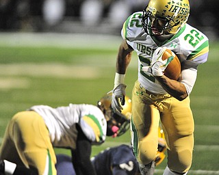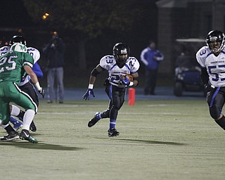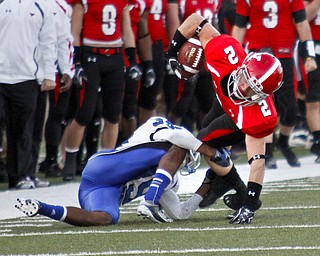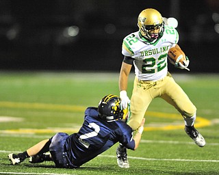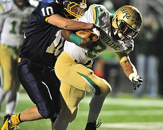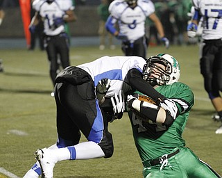 ROBERT K. YOSAY | THE VINDICATOR --..During first quarter action YCS #18 Ryan Coyier reaches for more yards as he is brought down by Mogadore #2 Hunter Van Camp.YCS vs Mogadore at Ravenna...(AP Photo/The Vindicator, …