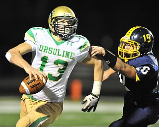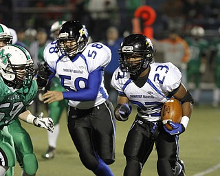 ROBERT K. YOSAY | THE VINDICATOR --..YCS #23 Ryan Grier is tripped up by #59 Jeremy Hugg as he tries to run around end during first quarter action.YCS vs Mogadore at Ravenna...(AP Photo/The Vindicator, Robert …
