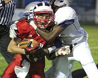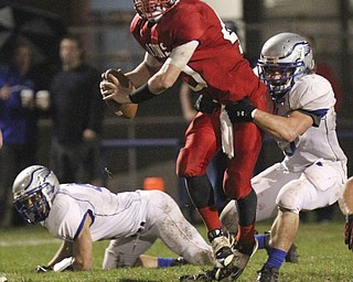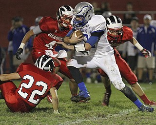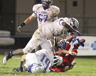 NICK MAYS l THE VINDICATOR (20) Ross Gould of Poland is tackled by (23) T.K. Fortson, (7) Chris Maze and Trey Bryarly of Howland during thier game Friday night in Poland. howland vs poland 10052012 …