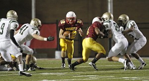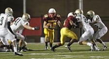 Mcdonalds #10 Cameron Ifft reaches for the goal line to score a touchdown while Western Reserve defensive back #22 Jon Timko tried to make the takle.