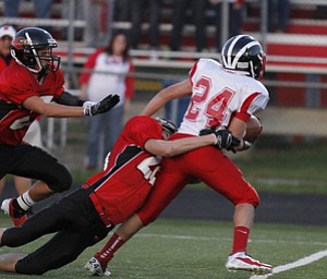 ROBERT K. YOSAY | THE VINDICATOR --..Brought down after a first down during second quarter action - is Niles #40 StefanYuhas - by Canfields #84 Kyle Nagy and #2 Nick Annichenni - after he got …