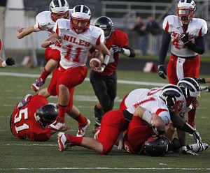 ROBERT K. YOSAY | THE VINDICATOR --..Canfields #21 Conner Kesner - is tied up after making a first down in first qquarter action - as he is brought down by Niles #60 Nick Lardas and …