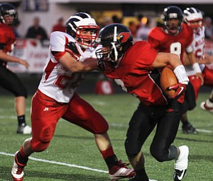 ROBERT K. YOSAY | THE VINDICATOR --..Canfields #9 Kim Kimu takes off for a 30 plus yard run and a first down during third quarter action as #40 Stefan Yuhas #60 Nick Lardas - #5 …