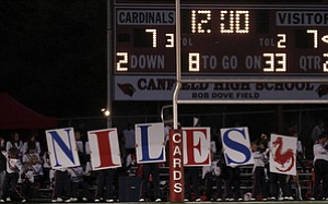 ROBERT K. YOSAY | THE VINDICATOR --..#11 Niles John Cicero goes into the Endzone draggin Canfields #84 Kyle Nagy - as Niles scored in the first set of downs -.Niles at Canfield - Bob Dove …