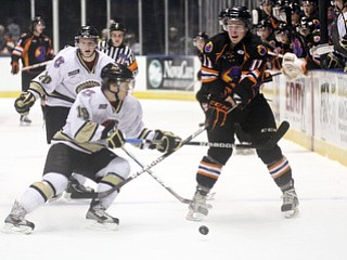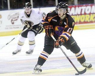 William D Lewis The Vindicator Phantoms Zach Evancho(16) and Kyle Connor(18) move the puck during 2-23-13 game with Lumberjacks.