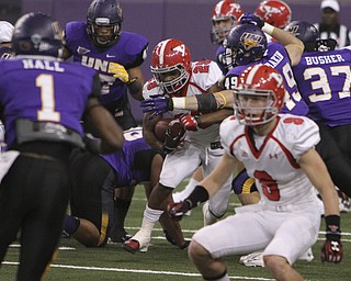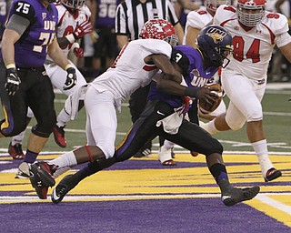 Northern Iowa's Kevin Vereen is tackled by Youngstown State's Donald …