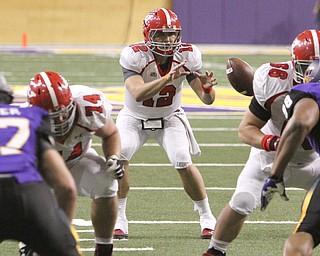Northern Iowa quarterback Brion Carnes just gets a pass away before being tackled by Youngstown State defenders in the second half of the game at the UNI-Dome in Cedar Falls, Iowa, Saturday, Nov. 9, 2013.
