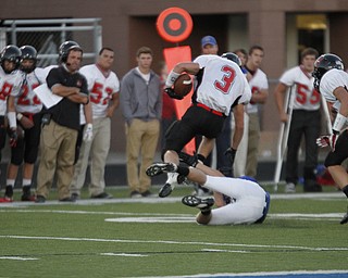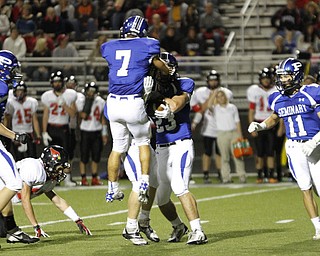 William d Lewis the Vindicator McDonald (6) is stopped by Western Reserve's (6) during 1rst half action 9-27-13 at McDonald. at right is (34)