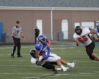 . ROBERT K. YOSAY | THE VINDICATOR..Polands #56 Zach Bader crushes Canfieds #9 Kim Kim behind the line for a loss during first half action..Canfield at Poland
