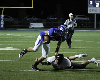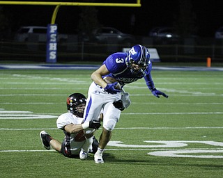. ROBERT K. YOSAY | THE VINDICATOR..Polands #8 George Chammas Jumps up for the a touchdown as #7 Nick Luchansky from Canfield trys to defend..Canfield at Poland