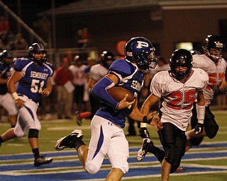 . ROBERT K. YOSAY | THE VINDICATOR..Polands #8 George Chammas breaks free of Canfields #8 Matt Milligan for a first down during second quarter action at Poland Dave Pavlansky Stadium..Canfield at Poland