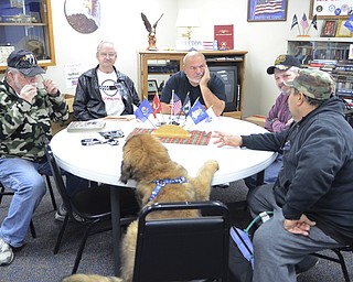 Katie Rickman | The Vindicator.Darrell Hassler of Austintown attempts to keep Mr. Fluffy out of his wood carving tool box at the Austintown Senior Center on Thursday, Dec. 4, 2014.Mr. Fluffy is an 12-week-old Leonberger …