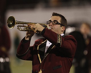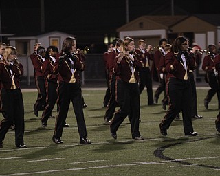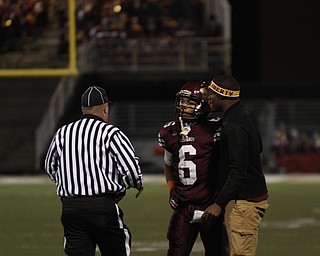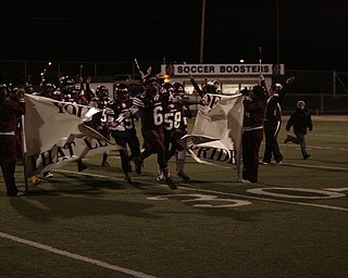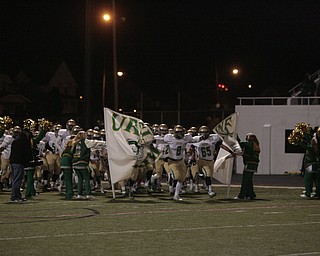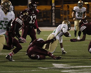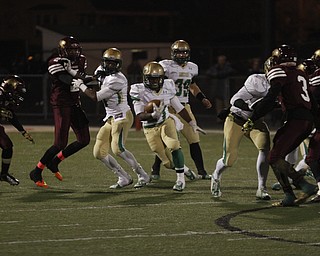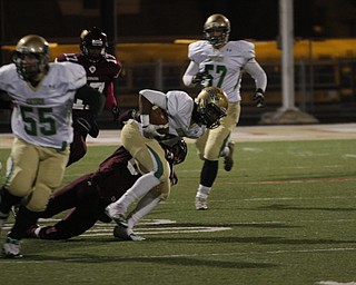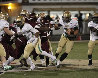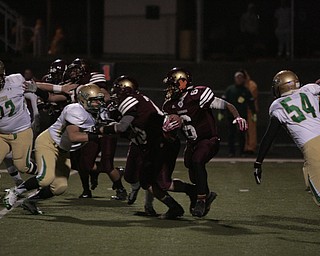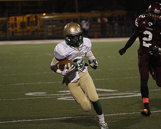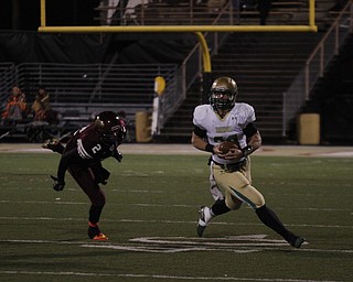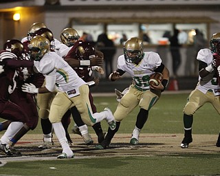 . ROBERT K. YOSAY | THE VINDICATOR..Ursulines #39 Vito Penza picks out a hole as Libertys #6 Lynn Bowden looks on ....Ursuline Irish vs Liberty Leopards at Mollenkof Stadium...-30-