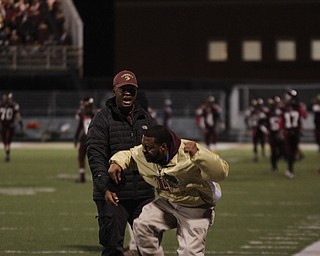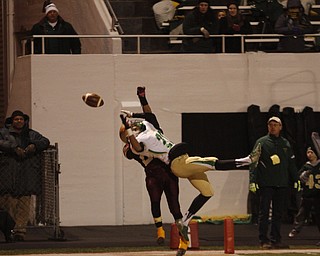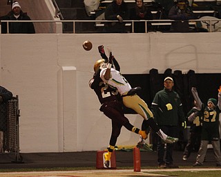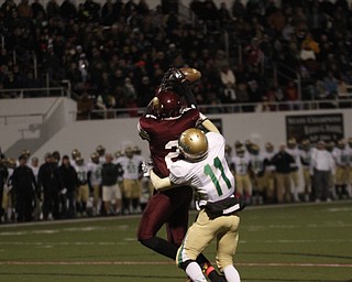 . ROBERT K. YOSAY | THE VINDICATOR..Ursulines #65 Devin Matthews pursues #6 Lynn Bowden as Bowden steps out of bounds in the endzone for two points for Ursuline late in second quarter..Ursuline Irish vs Liberty …