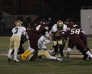 . ROBERT K. YOSAY | THE VINDICATOR..Ursulines #39 Vito Penza picks tries to jump over Libertys #6 Lynn Bowden during second quarter action as #44 Joe Kangas runs in..Ursuline Irish vs Liberty Leopards at Mollenkof …