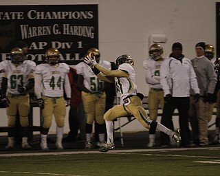 . ROBERT K. YOSAY | THE VINDICATOR..Ursulines #3 Kimauni Johnson runs into the endzone for the Irish first score on a three yard run as #21 Junior Blair #2 JaShaun Whitman fall down Uruslines #67 …