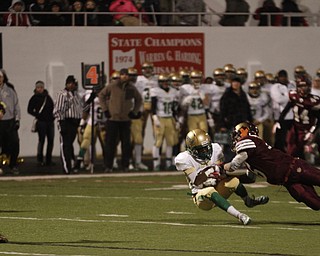 . ROBERT K. YOSAY | THE VINDICATOR..Irish #39 Vito Penza leaps over Libertys #5 Dre Rushton on his way to a first down in second quarter action -..Ursuline Irish vs Liberty Leopards at Mollenkof Stadium...-30-