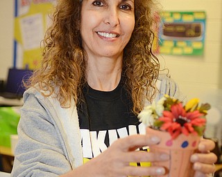 Katie Rickman | The Vindicator .Melanie Paez, 13, of Liberty holds up a pot that she made at the Akiva Academy on Thursday, Oct. 23, 2014. The Students will distribute the decorative pots on on …