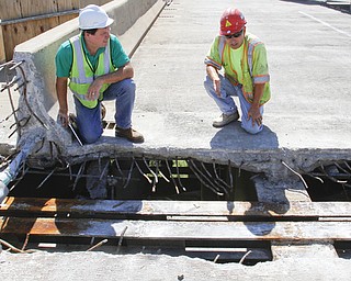 ROBERT K. YOSAY | THE VINDICATOR..Randy Partika - Mahoning county bridge engineer Dennis Gertko and Tony Gaglione of B>G>Trucking and Construction look at the under layment of steel where the expansion joints are being replaced.. …